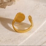 Crafted in a radiant gold finish, the open-band design ensures a comfortable and adjustable fit, making it suitable for different finger sizes without compromising on style. The smooth inner band provides all-day comfort, while the statement shell ends give the ring a high-fashion, resort-ready appeal.